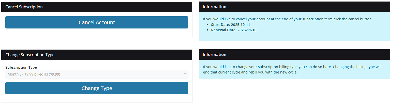 Canceling your account is as simple as clicking the blue Cancel Account button as seen above. On the right hand side you will also see information regarding your subscription like the Start Date and Renewal Date. If you would like you can also adjust your subscription type here. Adjusting the subscription type allows you to switch to our other plan types.