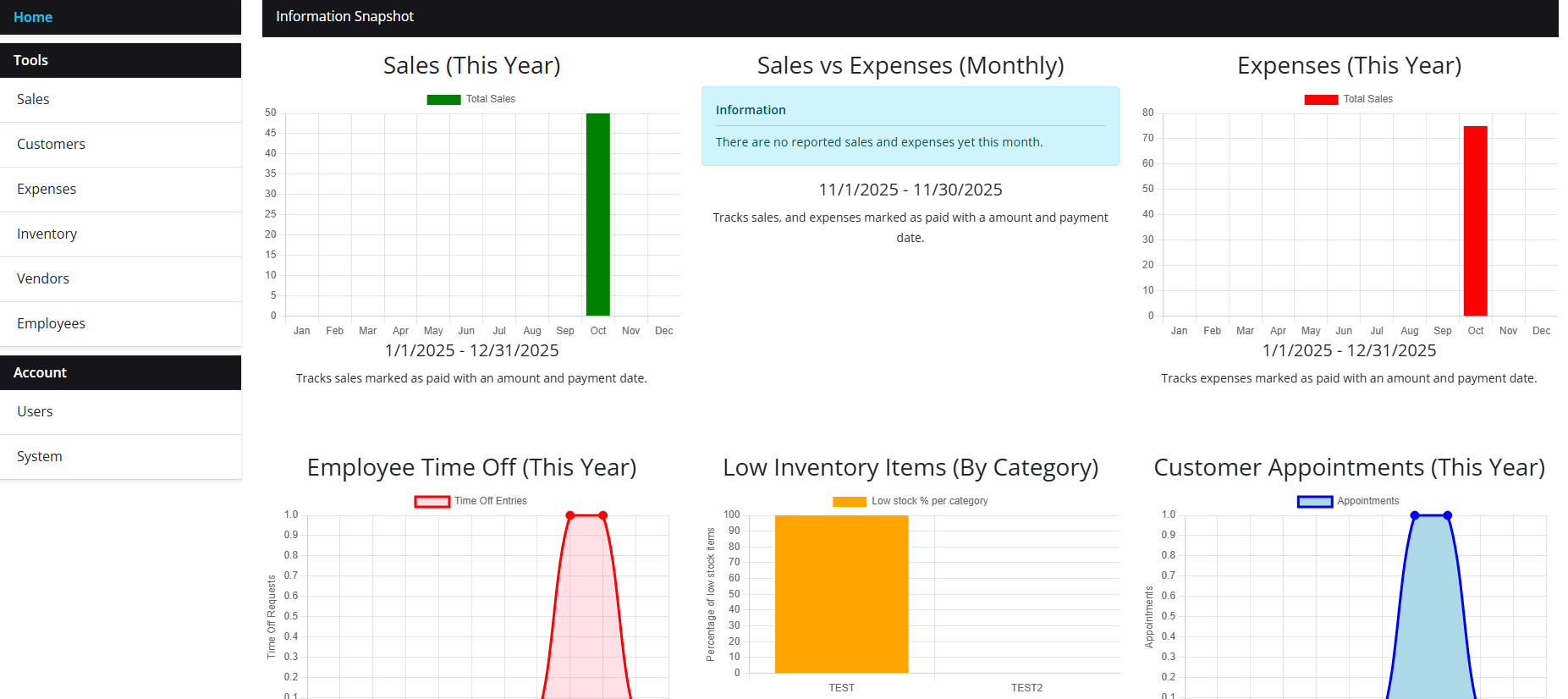 The Seysoft home page provides an Information Snapshot of your business with a variety of different charted statistics. These charts are automatically populated based on the information collected regarding your sales, expenses, employees, and inventory. Our system automatically parses this information and the charts are predetermined. As a possible feature update we are considering allowing our users to create their own homepage based charts but currently the charts on the Information Snapshot are already coded in. The charts provided on the homepage are: