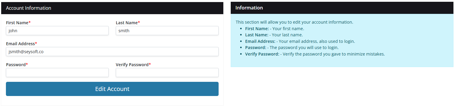 On most of the Seysoft pages and modules there will be a blue Information display near the right hand side of the page. While the docs here give detailed step by step instructions the Information displays also give good concise info for assisting in using the module. We recommend making use of the information in those displays for quick reference before visiting the docs. Below is an example of one of the blue information displays taken from the Account section.